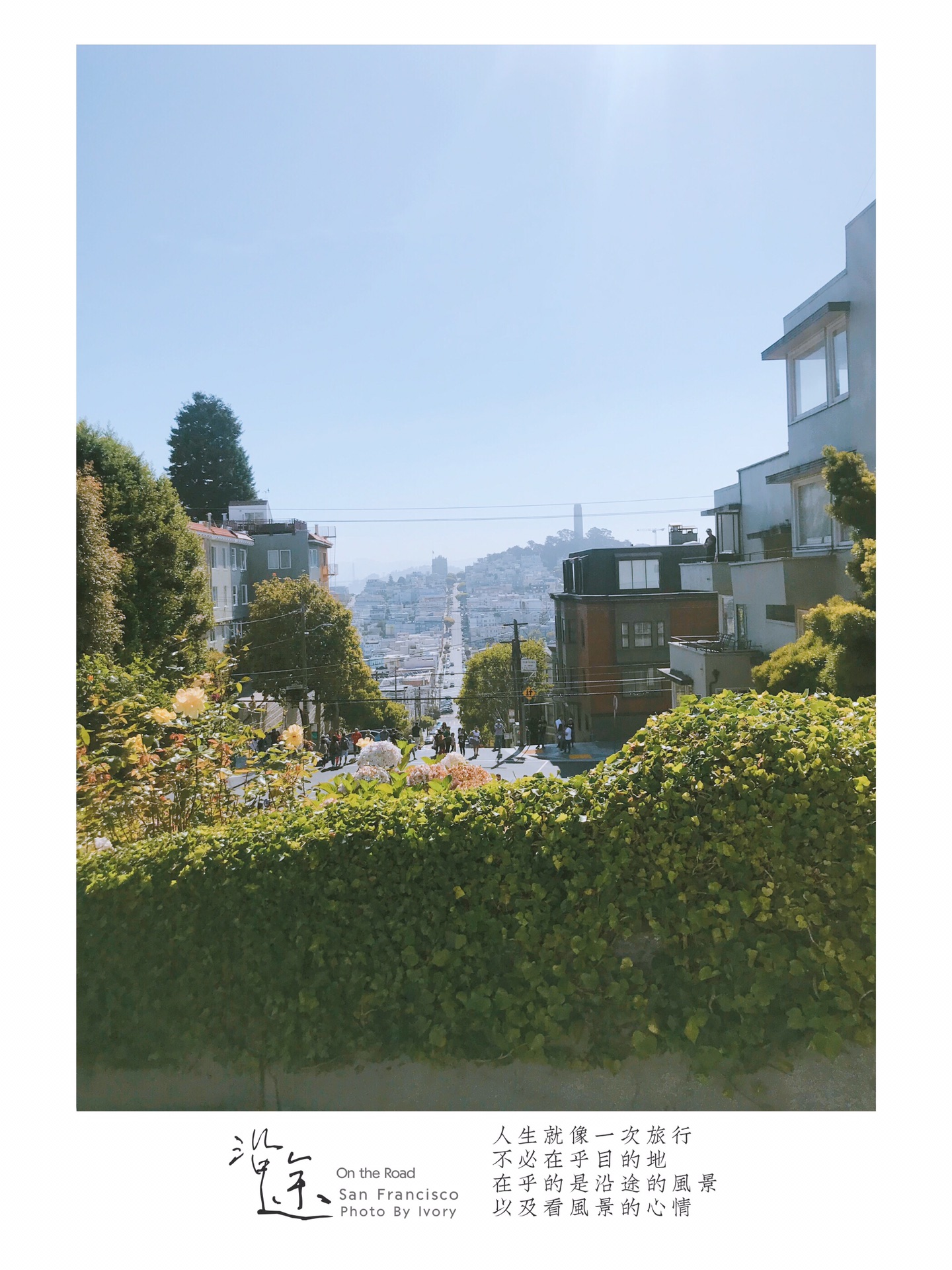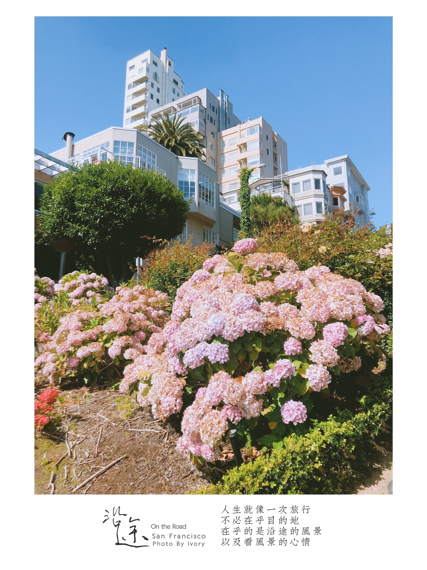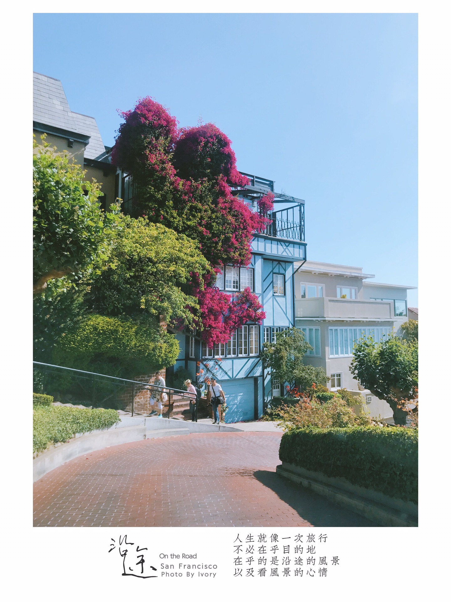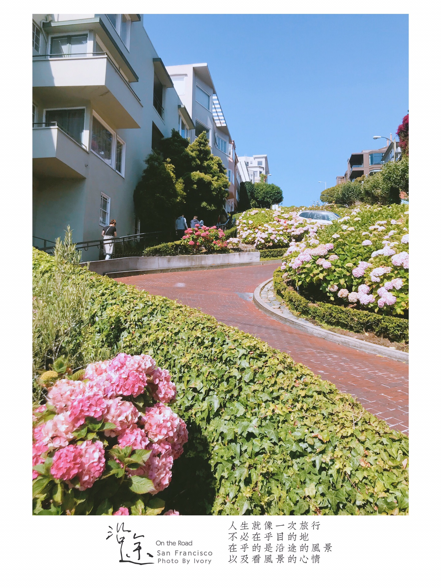 这是老公最喜欢的 旧金山 景点——九曲花街。从九曲花街单行道,按路线车道往下,按180度的幅度绕着花坛往下,两侧是漂亮的小洋房和大片绣球花,远眺是破地下的一片蓝色大海,太美了。老公玩了一圈又来一圈,开心得像个玩旋转木马的小孩。