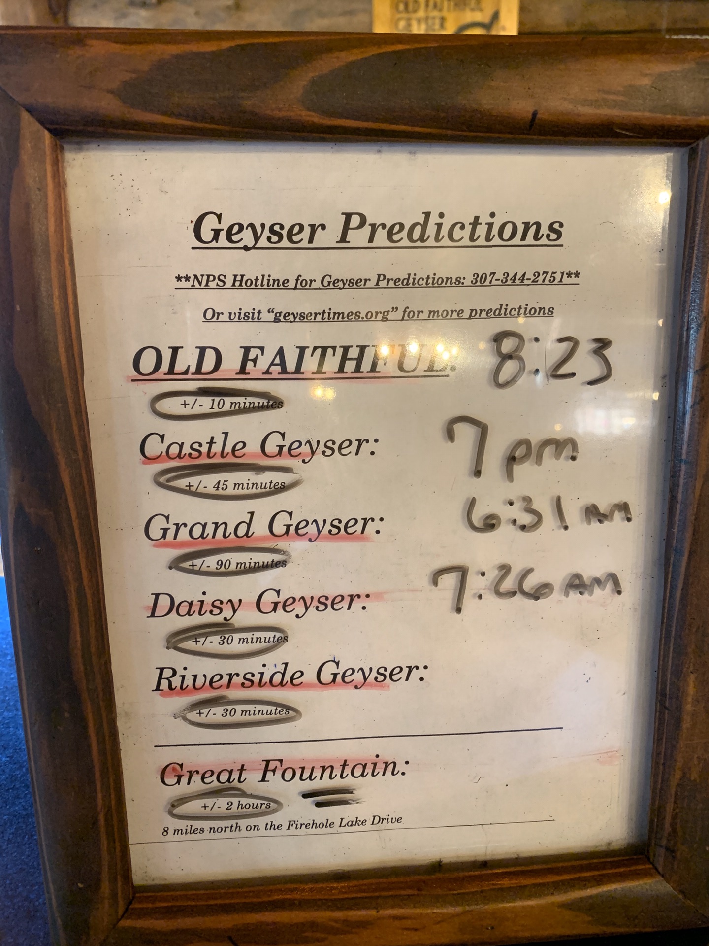 住在这里的另一个好处是,晚上九点多我们还看到了准时喷发的间歇泉。酒店前台标注了各个间歇泉下次喷发的预计时间。