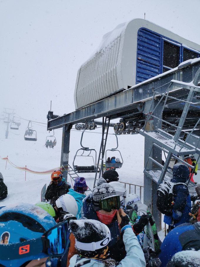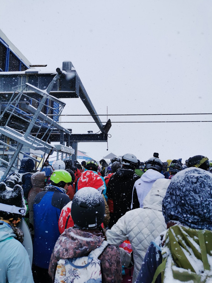 Tamar觉得我们学得差不多了,还把我们拖扯上了挺高的正式滑道,下面这人头涌涌排队的就是坐缆车上滑道的人流。