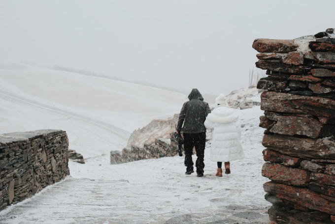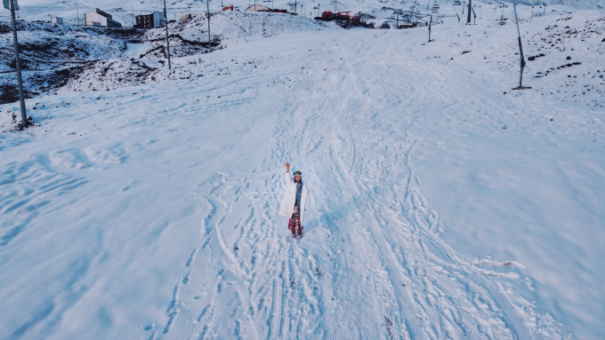 雪地里的大疆只能在手中起飞和降落,我们算是初级飞行员而已,整个过程有点战战兢兢的,还好效果还不错。