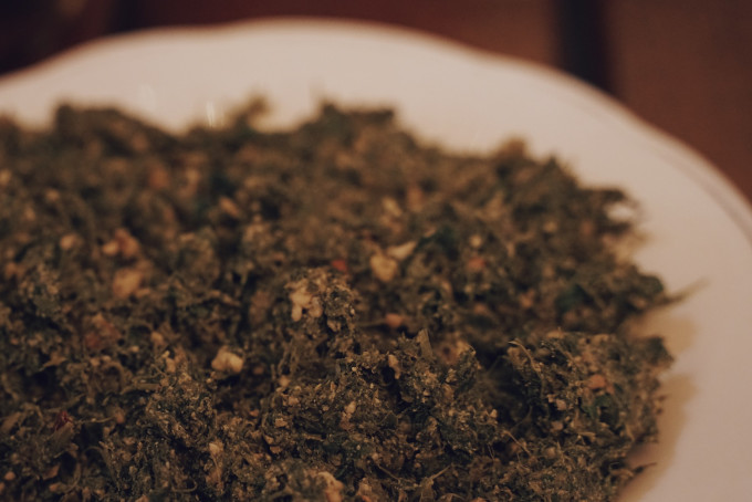 哈哈哈哈哈,我们俩当时笑死了,心路历程就是两人大喜过望发现居然有蔬菜!看着还很像是蒜蓉炒的,于是问了一下老板,老板说对啊是蔬菜,还有些花生呢,这样听来也不错啊,即使是蔬菜炒花生好想也没有雷区。但上来后简直惊呆了,这差不多剁成蓉的不知名蔬菜里拌了花生和一些别的香料,吃起来虽然不难吃,但根本不是我们所期盼的蔬菜啊。
