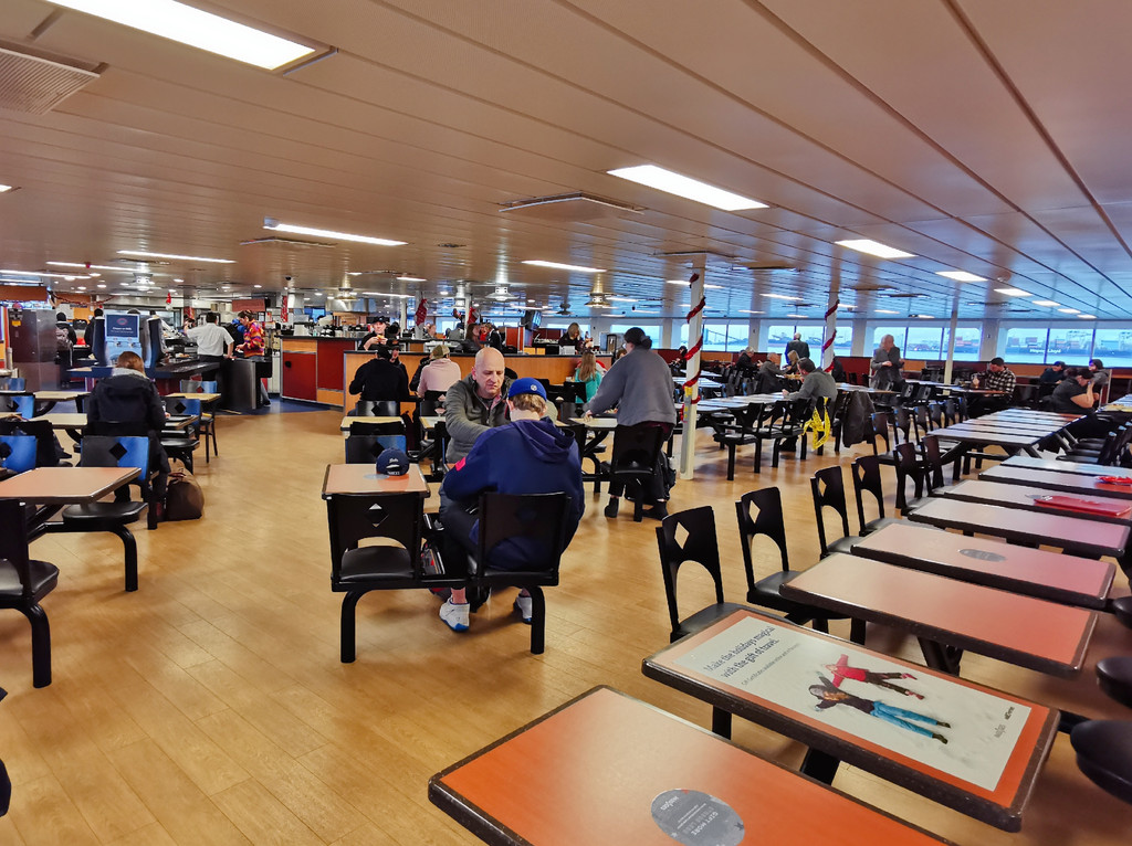 说是渡轮,可能会给人很小的错觉,其实是吨位很大的船,可供游客活动的范围就有两层楼。包含了各种不同类型的客席,有适合休息的软座,有适合家庭打牌聊天的圆桌方桌,有适合要抓紧时间工作或学习的办公桌,有给宝宝玩的游乐区域……