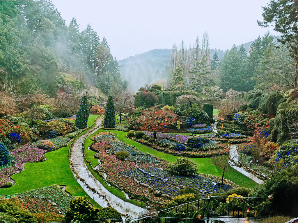 布查德花园(The Butchart Gardens)位于加拿大不列颠哥伦比亚省温哥华岛,距离省府维多利亚以北约23公里。这里在上世纪初本是布查德先生的石矿场,在开采殆尽时,他的太太产生了将这里改造成一座花园的想法。始于一个女人浪漫的幻想,这对夫妇开始游历世界,带回世界各地的奇花异草,将这里打造成一个似梦似幻的仙境。在开矿的深坑打造了最初的下沉庭园后,又进而开拓了日式庭园、玫瑰园、意大利花园和地中海花园等。现在在这座有百年历史的花园里,每年的三月到十月都鲜花盛开,宛若一片花海。而在其他的时间段,这里就更是别有一番风趣了!跟随我一起去探索冬日里的童话世界吧!