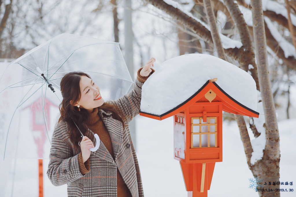 老公还说,放心,小樽是什么海洋气候,一天到晚在下雪,呵呵,小太阳来了挡也挡不住。亏得是包车,两把伞扔车上也不碍事,在神社周围没什么人我还拿出来摆拍两张,到了小樽我是连拿都懒得拿了。