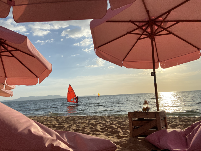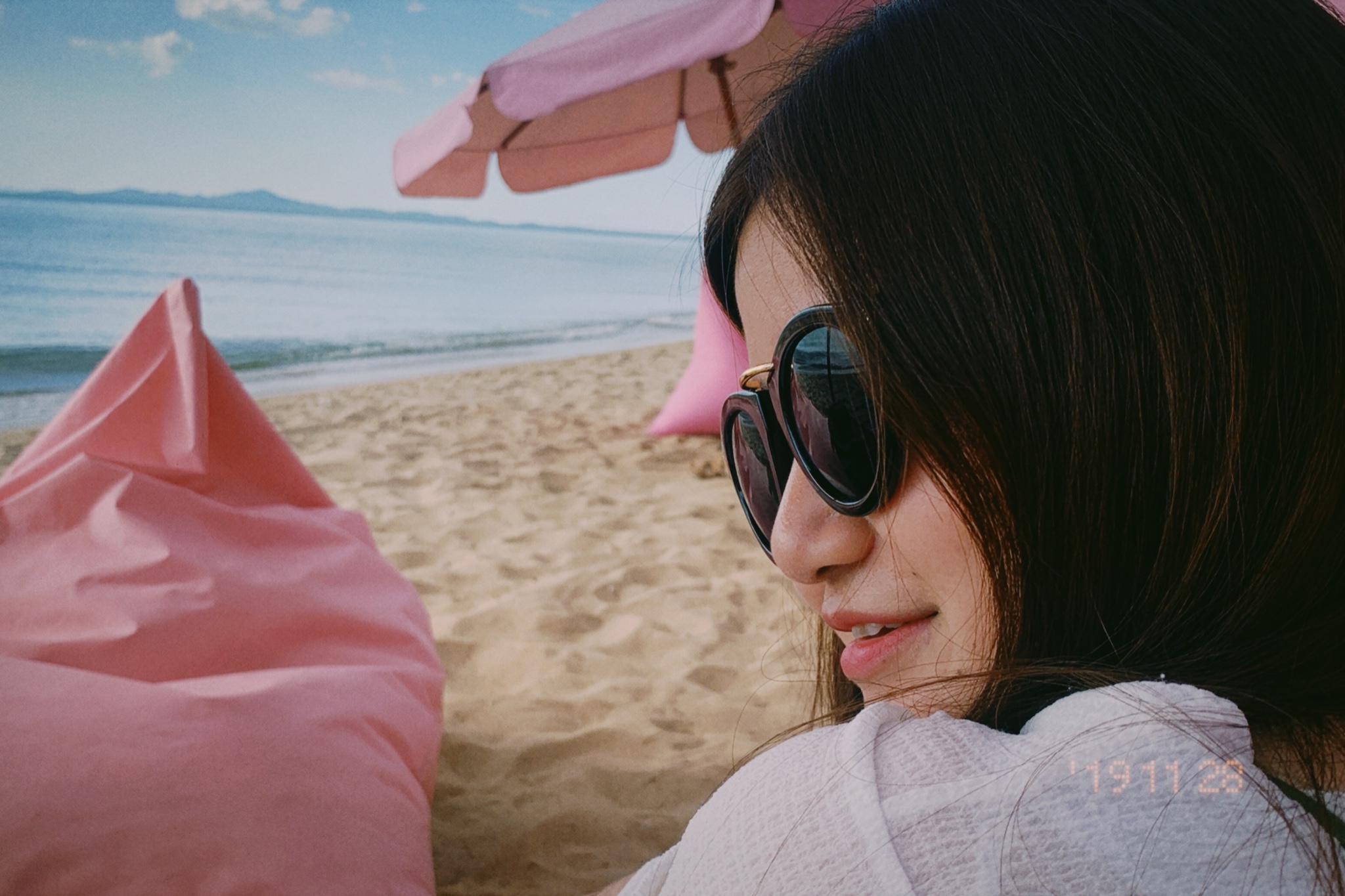 粉粉红红的沙发们排排坐在沙滩上,幸福的人儿躺在上面尽情享受着阳光☀️和海风 🌬