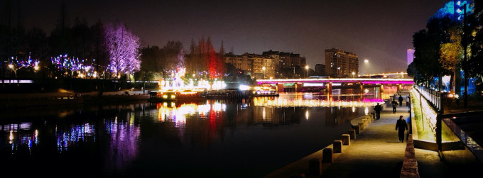 溜达到夫子庙秦淮河步行街,晚上。快要跨年了,整个步行街在为跨年活动搭建活动舞台什么的。