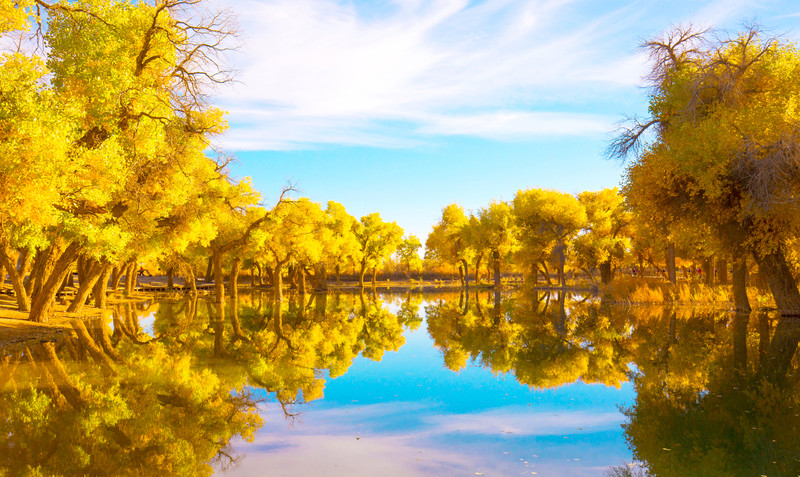 这里水系发达,胡杨与水相融,再加上天空的映衬,倒影迷人,随手一拍即是大片!真是完美的摄影打卡地!“此景只应天上有,大漠胡杨水境林”。