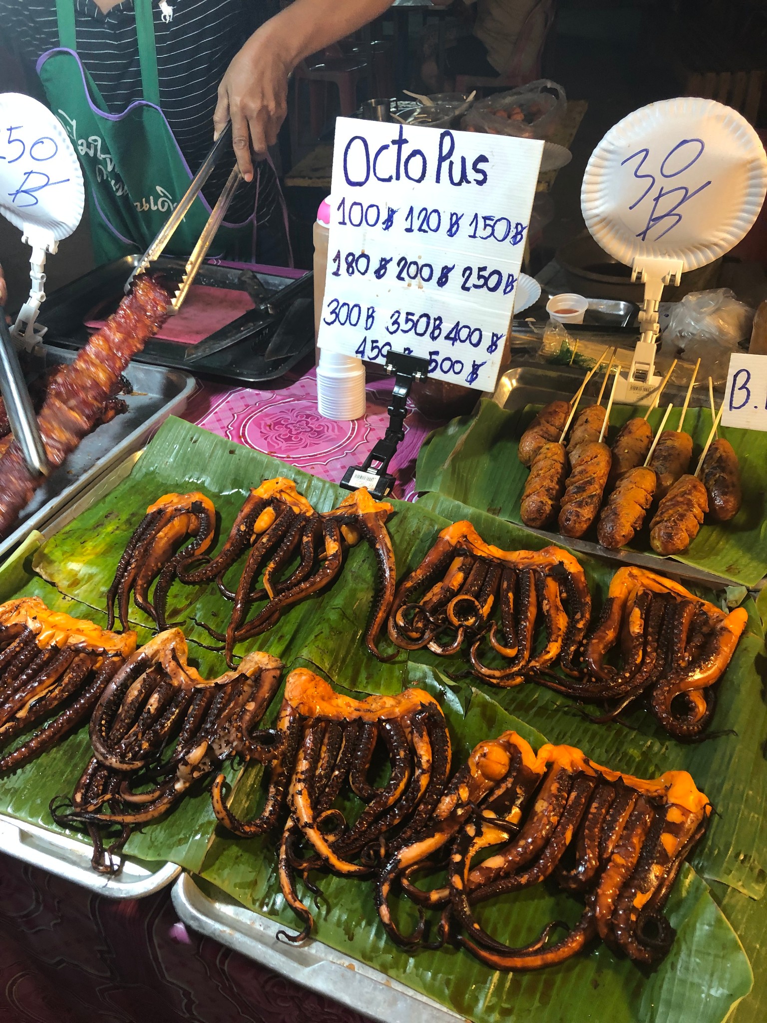 门口停着很多车,看起来很有人气,是一家很地道的泰餐馆,餐厅很大,装修环境比较一般(吃饭期间不断有苍蝇光顾,餐具简陋且不是很干净),但是个人感觉味道很local。我们点了炒粉、凉拌鱿鱼、烤鱼还是蛤蜊汤,都是很传统的泰式做法。泰式炒粉味道很棒,尤其喜欢沾着花生碎吃;凉拌鱿鱼是蒜香味的,鱿鱼分量很足,老公很喜欢;泰式烤鱼也不错,外表金黄酥脆,内里的鱼肉很嫩很新鲜,就是下面的汤汁齁咸,不沾汤汁反而好吃;点的不辣的蛤蜊汤,里面好多个头很大的蛤蜊,汤齁咸且卖相不是很好,最后光吃肉了。味道总体来说还是不错的,性价比较高。推荐一试!