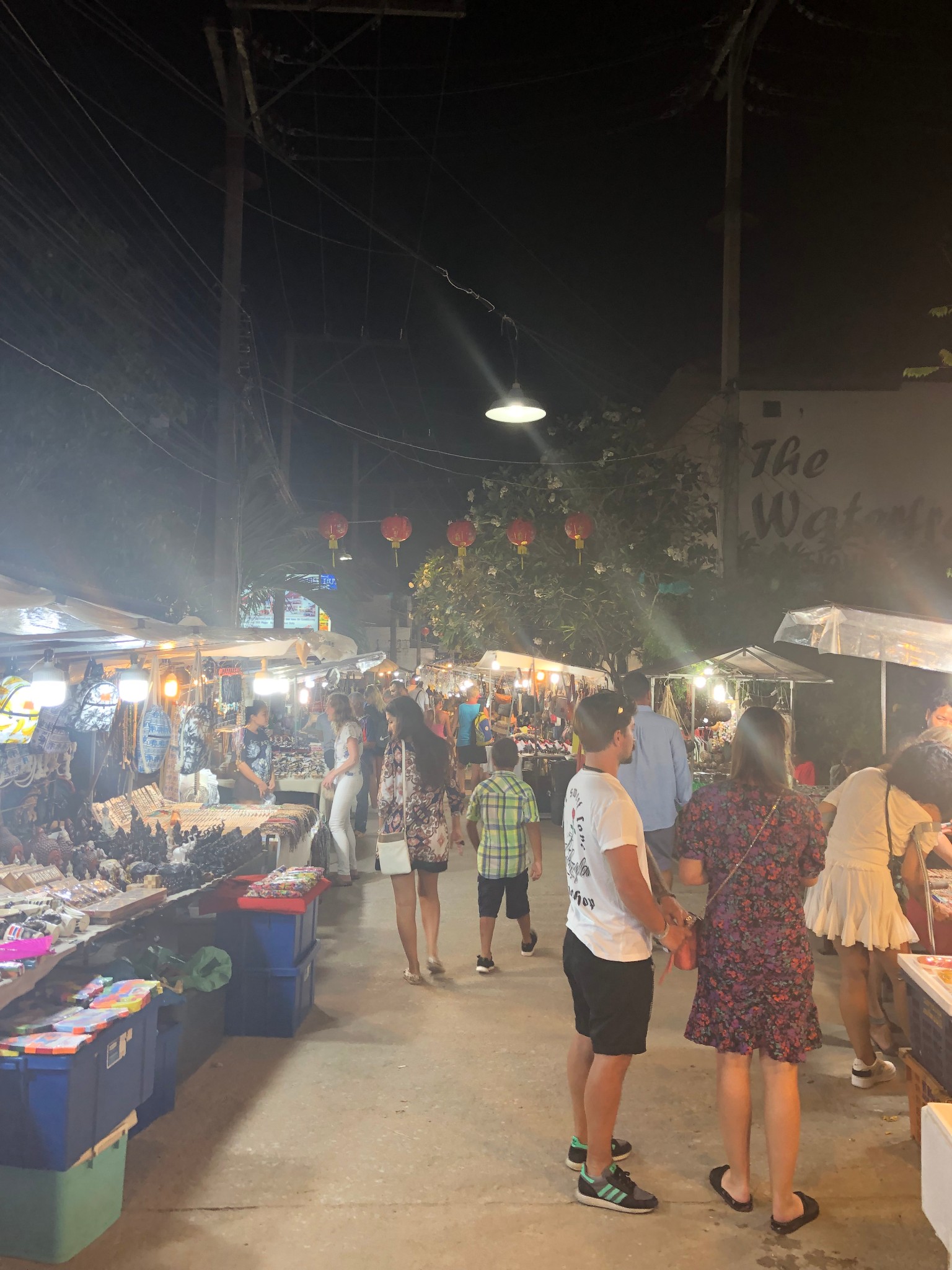 7点多天色完全黑了,意犹未尽地奔赴下一站—— 波普 海滩的Fisherman’s Village夜市。果然周五的渔人村跟平时大不一样,从入口一圈停满的摩托车就可以看出。步行街上摆满了各式各样的小摊——手工艺品、衣服、小吃等等,人来人往,热闹非凡,路边的很多餐馆里也坐满了人。