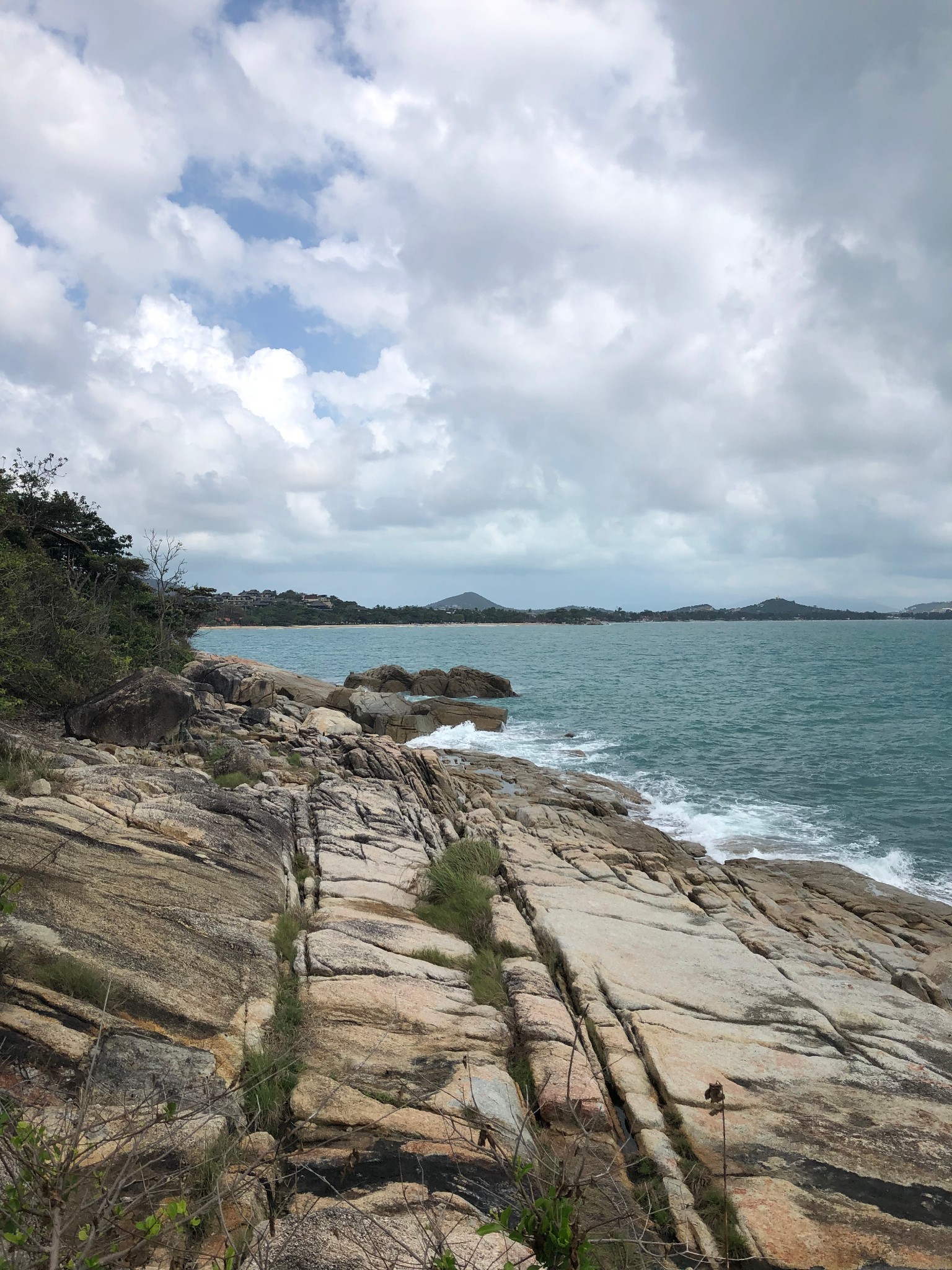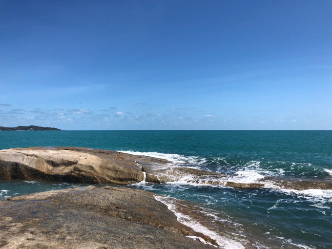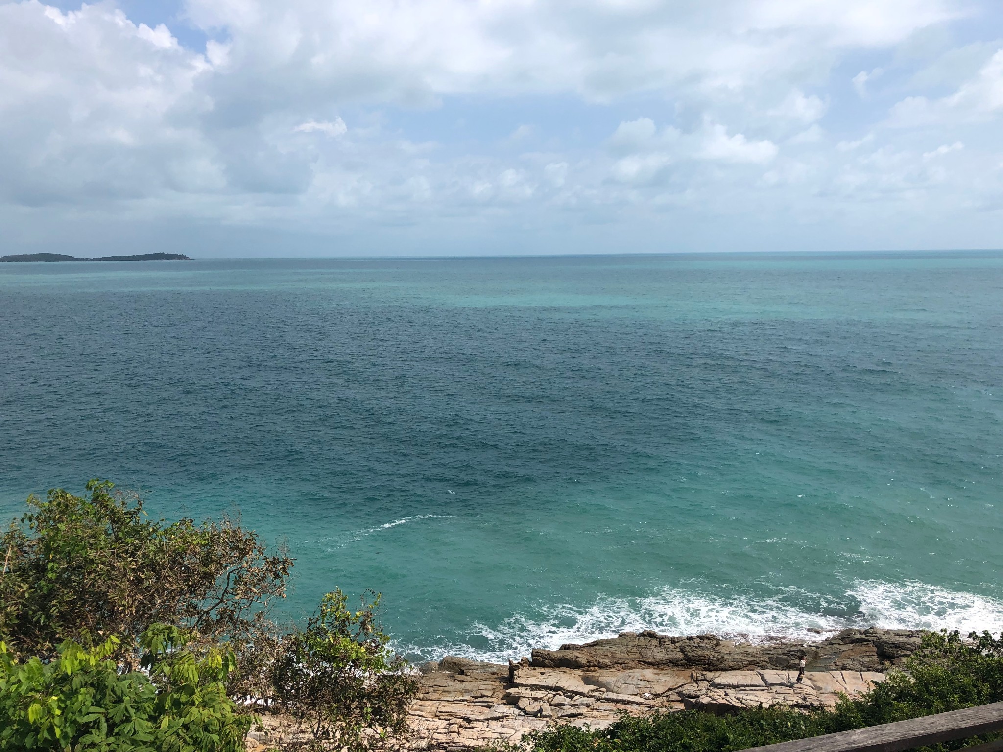 第一站来到了Lad Koh View Point,此时天已完全放晴。这个观景台位于查汶区和拉迈区之间,就在环岛公路的路边,只要路过这里就不会错过。观景台的地势较高,在这里能看到整个查汶湾和拉迈湾。从观景台沿台阶可以下到海边岩石上,这里的岩石还是很原生态的,石头表面崎岖不平,不好走(胆大的我穿着人字拖走了一圈还是挺危险的,建议大家穿沙滩鞋),石头缝里很多野蛮生长的杂草。