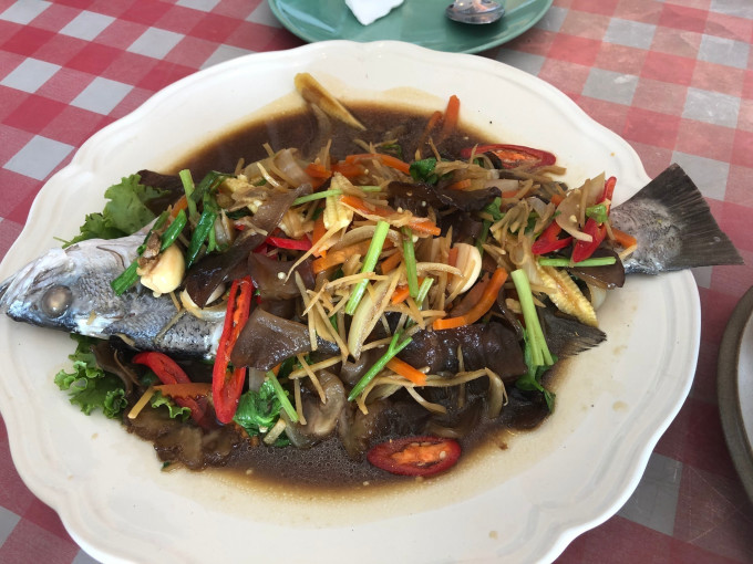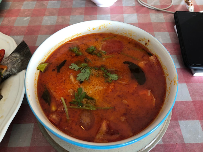 TripAdvisor(猫途鹰)上评价挺高的一家餐馆,老板是个白人,厨师是 泰国 人。餐馆小小的,装修也很一般。根据老板的推荐点了据说是 中国 人点击率高的两道菜——一个清蒸鱼上面很多乱七八糟的蔬菜和一道冬阴功汤。吹爆这款冬阴功汤,把酒店餐厅的冬阴功汤秒成渣渣。这是我在岛上几天里吃过的最好吃的一道菜了,喝了个底朝天。清蒸鱼的鱼肉本身还是挺新鲜的,但是吃着没味,这种说是清蒸鱼又四不像的做法出来味道确实不怎么样,还不如点 泰国 人常做的烤鱼。总体来说值得推荐,一定要点冬阴功汤哦!