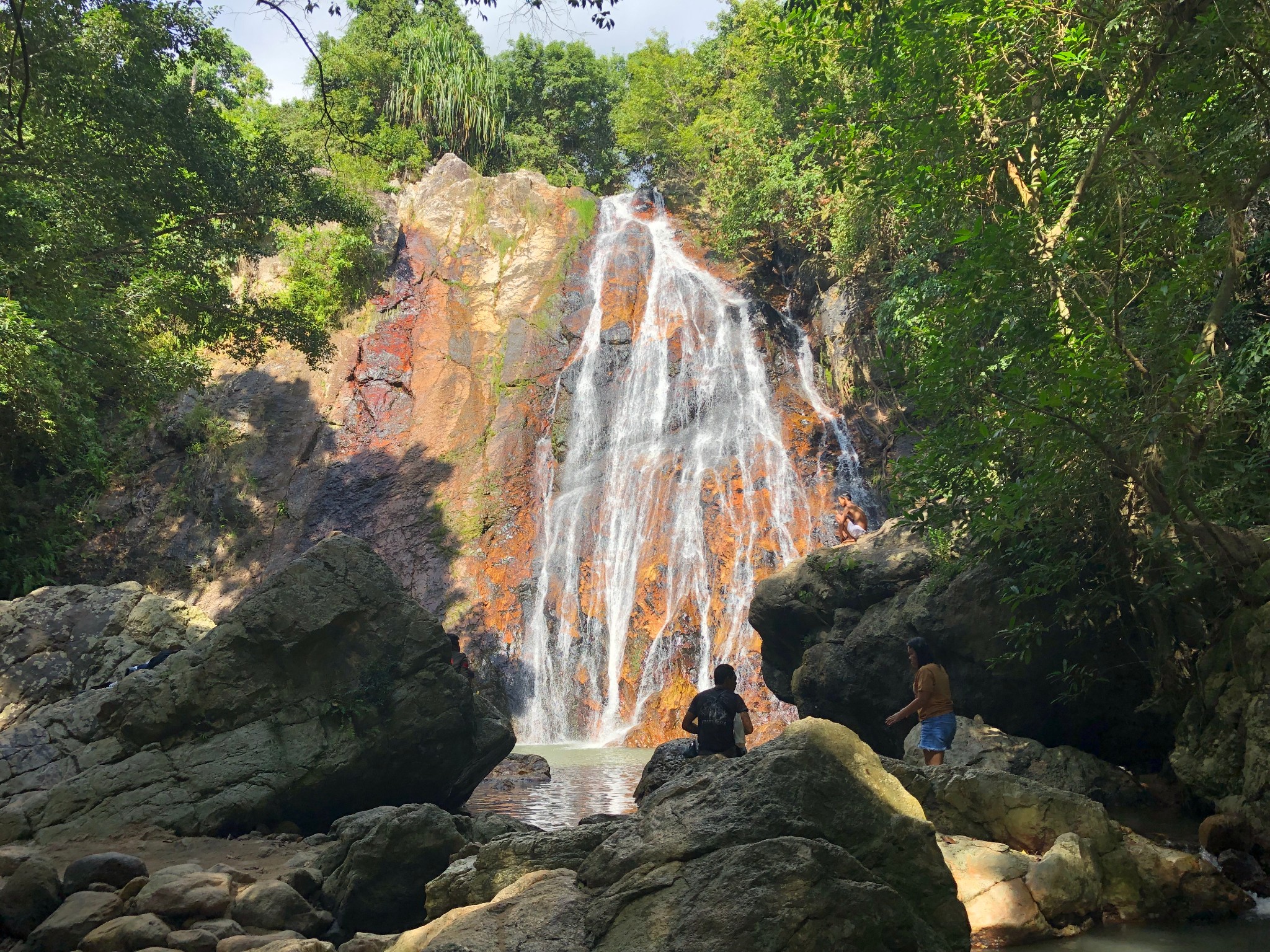 第四站:纳芒1号瀑布(Na Mueang 1 waterfalls)。瀑布不算大,海拔不高,不用爬山。据我不准确目测,这瀑布大约有5米高的落差,下面的水潭里有人在那里游泳,水不是很干净清澈,远不如在海 水里 游呢!纳芒2号瀑布据说是岛 上海 拔最高的瀑布,就在1号瀑布附近。根据导航,去2号瀑布的路是一条荒草丛生很窄的小土路,看样子也就越野车能开过去吧!慎重起见我们就放弃了。
