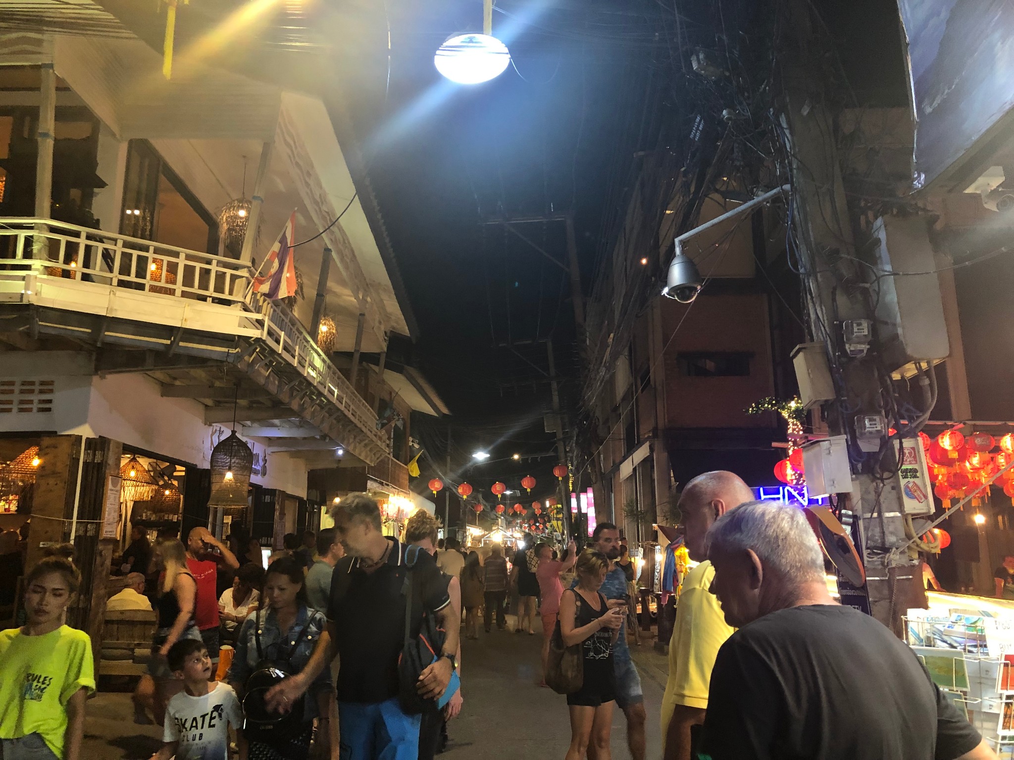 继续赶路,路过湄 南海 滩的一个唐人街,停下来进去看看。街上都是餐馆和小酒吧,说是唐人街,但是做生意的都是 泰国 人,没见有 中国 人。周四这边有夜市,我们去的时候5点多,各种小吃摊已经开始摆上了。唐人街不长,走到尽头就是沙滩。