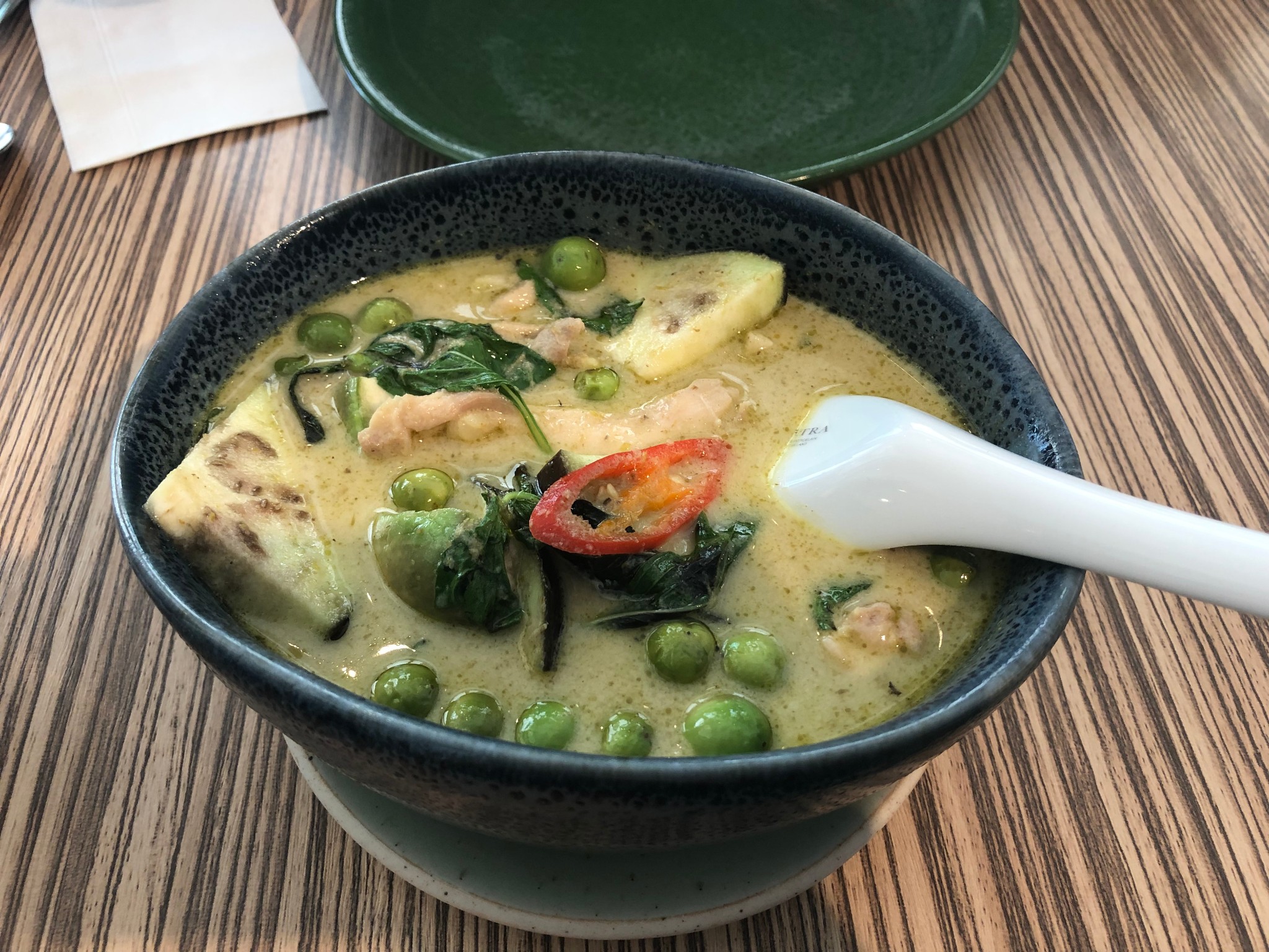 这家餐馆装修很新也挺小资,最重要的是环境看上去净整洁。我们点了绿咖喱椰汁鸡和泰式海鲜炒面,一共471泰铢(服务费和小费自动算进去了)。菜的分量都好少。咖喱汤很好喝,但是特别辣,没敢多喝,不喜欢吃鸡肉的我竟然觉得里面的鸡肉很嫩很好吃。海鲜炒面沾着蘸料吃味道也不错,但是对于来自面食之都习惯大碗吃面的人来说一人一筷子就没了……两道菜算是店里的推荐菜,总体来说味道不错。
