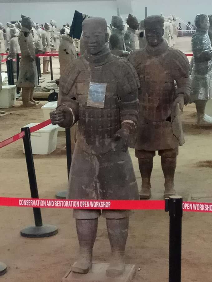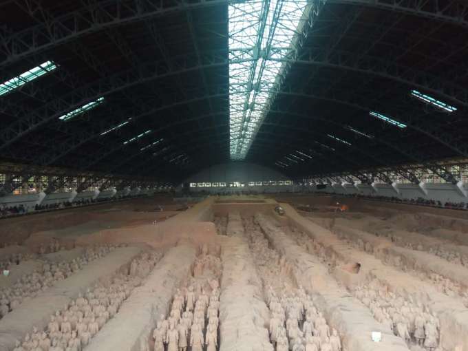 后面接着战车和步兵相间的38路纵队构成军阵主体;俑坑南北两侧和西端各有1列分别面南、面北和面西的横队,是军阵的翼卫和后卫。好一个2000年前的古代大军阵,他们披坚执锐,军容严整,气势雄伟,势不可挡。