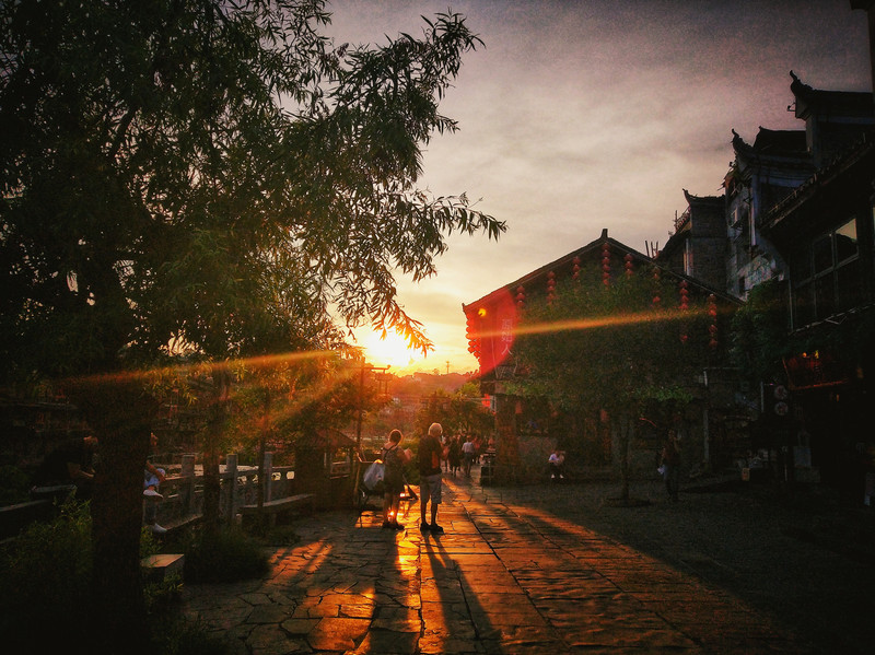 听着船夫们的对歌,看夕阳余晖渐渐的落下山坡,就这样静候夜幕的来临。这令人震动的古城晚霞,终于我也等到了。