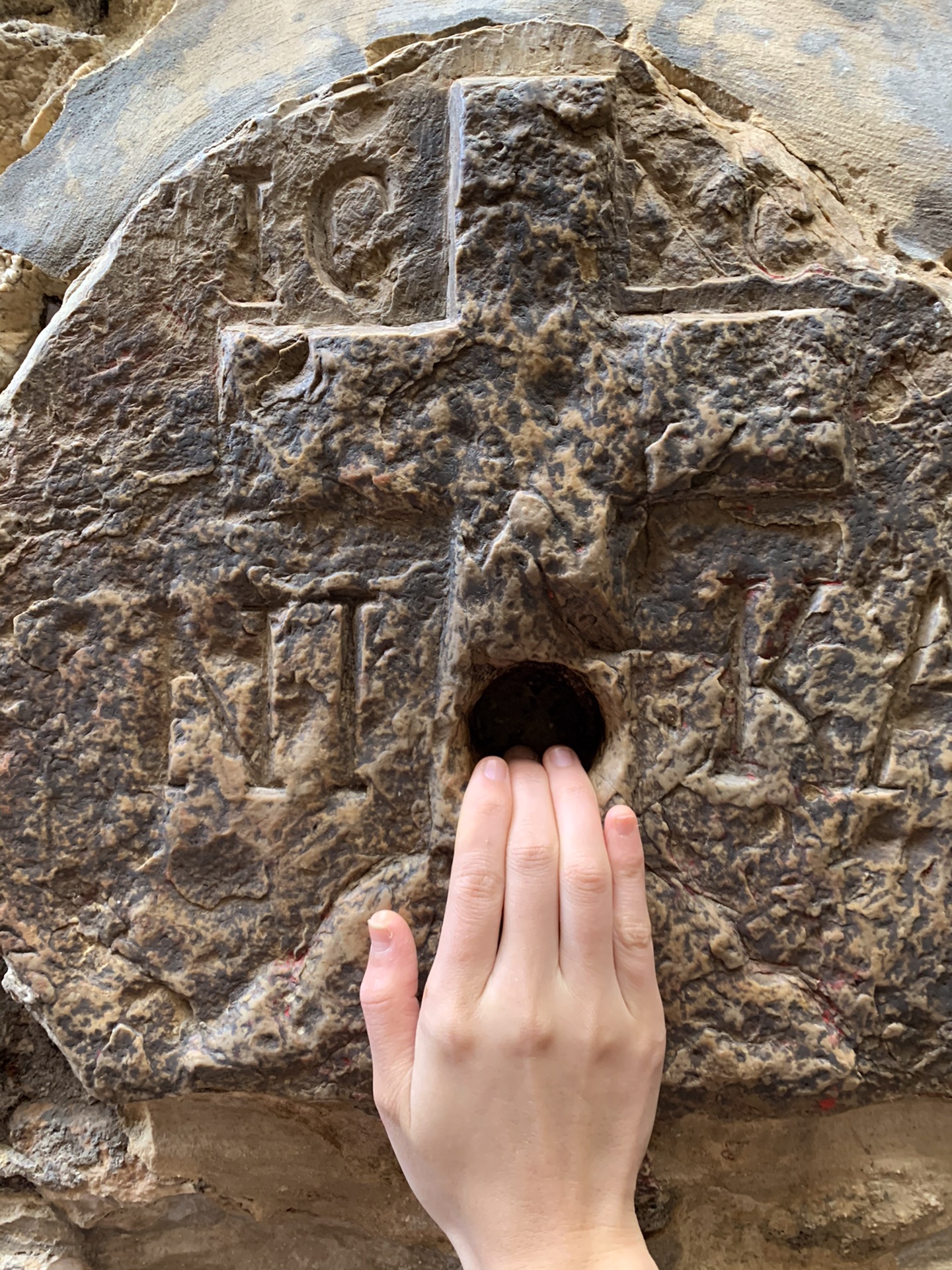 我们随着苦路一路走向耶稣最后掩埋的教堂“圣墓教堂”。圣墓教堂进门处,一块红色的 大理 石安放中间,这是当时的人们把耶稣从十字架上解下来,安放在这块 大理 石上涂抹膏油、准备安葬的中央。 大理 石前方墙上的壁画细致描画了当时的情形。许多忠诚的教徒,把信物放在 大理 石上擦拭,然后带回家供奉起来。更多的人则是长时间跪下亲吻这块听说是渗透着耶稣的血的石头。我跪在红色 大理 石的面前,将头深深地埋下,将项链在 大理 石上触碰了一下。