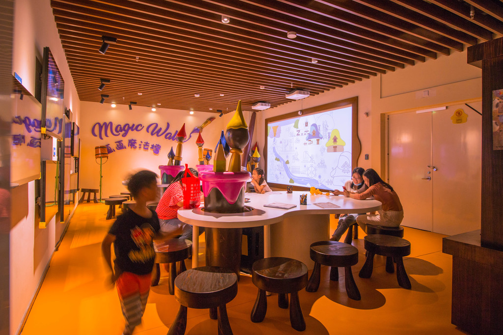 千万不要以为这只是一个给小孩子画画的地方,大错特错了!我一开始也就是进来随便逛逛,看到很多小朋友都在创作自己的蓝精灵,可能不能称作蓝精灵,毕竟都被他们画成了各种奇特的颜色哈哈。奇妙的是,在这里画好的蓝精灵通过扫描,就可以投射到电子屏上,纸上的蓝精灵突然在显示屏上动了起来。对于我这个大朋友来说都是黑科技体验。