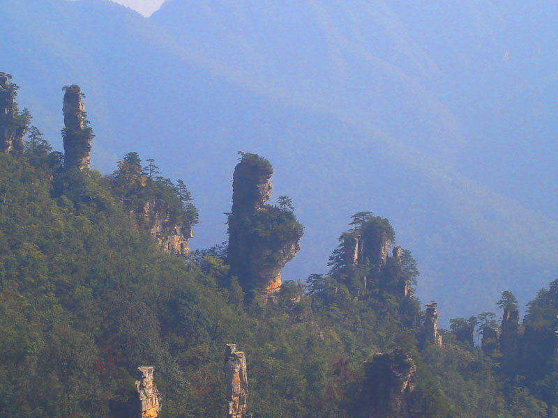 袁家界。是张家界公园又一处风景集中地。自金鞭溪紫草潭左入杉刀沟可上袁家界;顺袁家界台地边沿,绕荒径小道亦可下至金鞭溪千里相会处;亦可从袁家界去天子山、杨家寨。