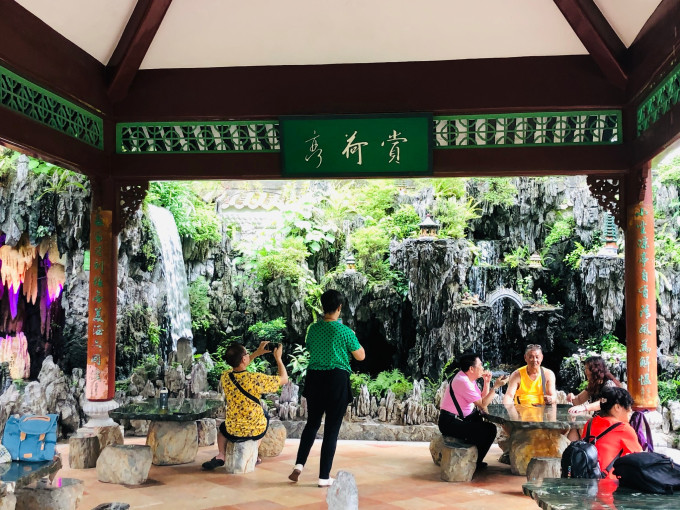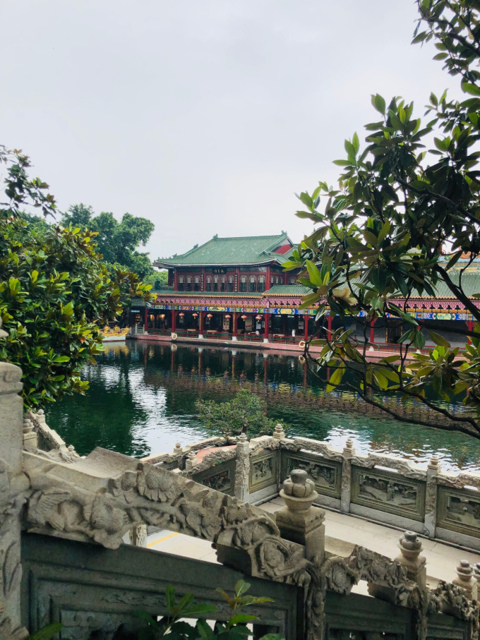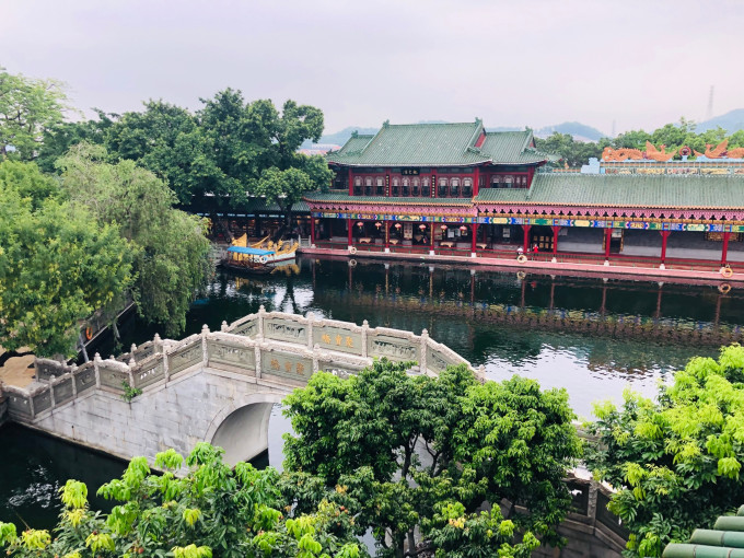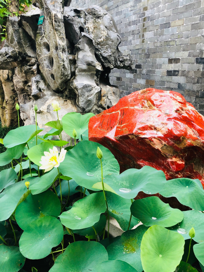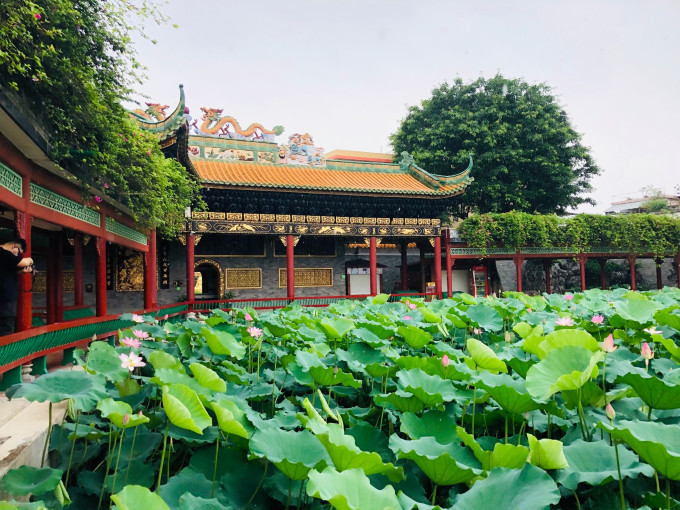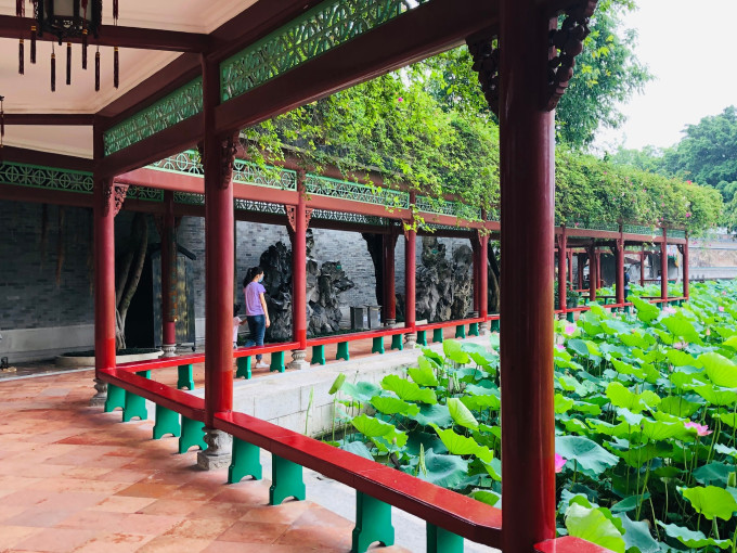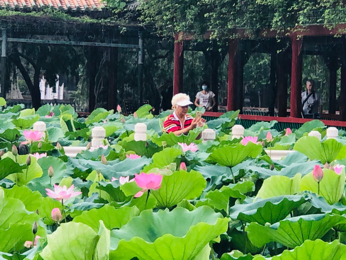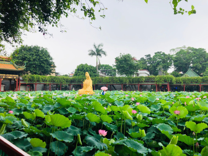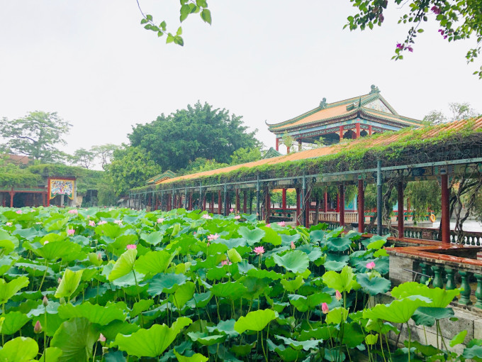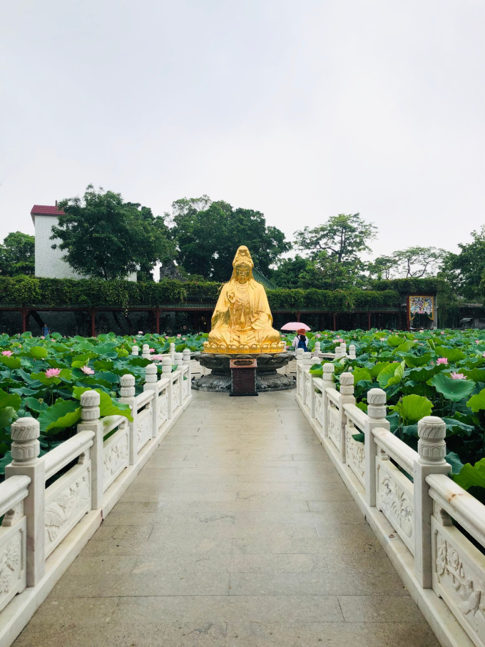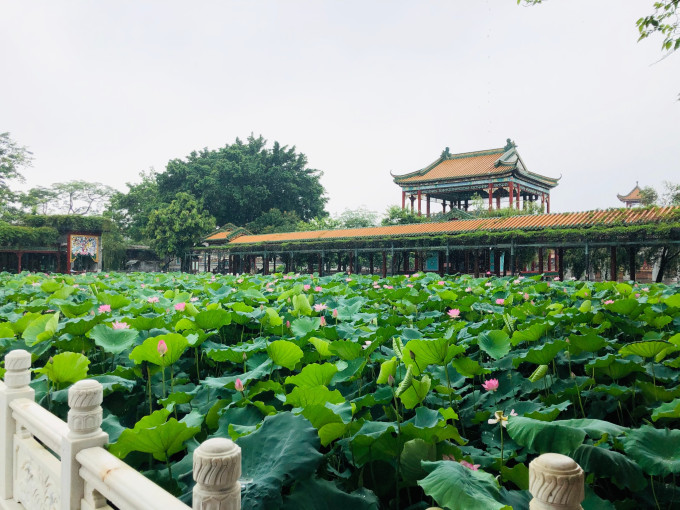 宝墨园水域广阔,其中荷花池内荷叶田田,盛夏时节荷花怒放,莲池中央的莲台上有观音坐像,可谓莲花胜境。