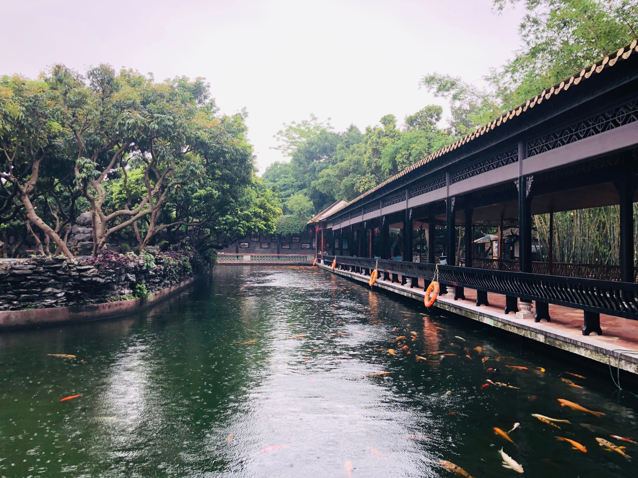 宝墨园园内河、湖交错,水面面积占全园面积的百分之四十,其中放养锦鲤10万多,充满珠三角的水乡风情。 九龙 桥下的鲤鱼涌、清 平湖 、宝墨湖以及多处小河,均是观赏锦鲤的好去处。假如你向湖中投放一些鱼饲料,骤然万头攒涌,象离弦之箭向你飞速而来,重叠跳跃,争相觅食,一湖绿漪,激起红浪,故名为“鲤翻红浪”。
