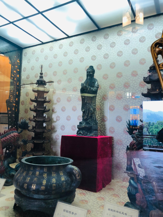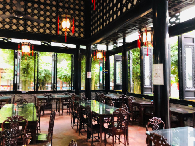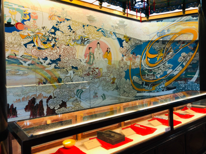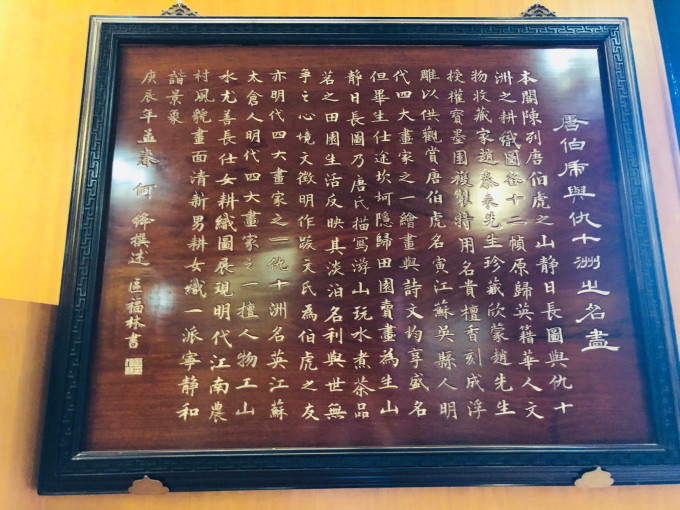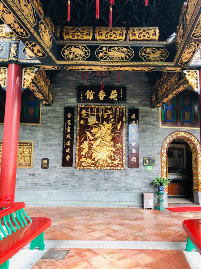 船头上的大型木雕“百鸟朝凤”更是栩栩如生,金碧辉煌。100只鸟儿,各具风姿,舫内摆设,全由花梨和酸枝木精工制成,宫廷式的几椅,配以仿宋代器皿,豪华夺目。“九狮会金龙”大型屏风和《清明上河图》精彩片段的雕刻,造工精湛,更称精品。舫内一楼,是可容40人品茶听曲的场所,以演奏 广东 音乐和粤曲为主。
