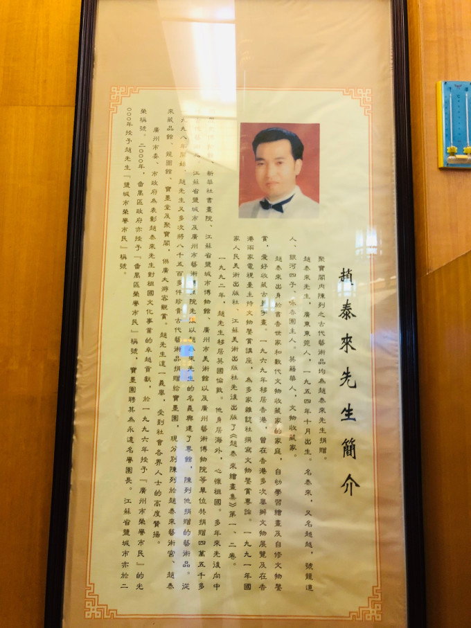 赵 泰来 藏品馆按珠江三角洲晚清时的祠堂(宗祠、家庙)规格而建,外面是双卷耳山墙(即子子镬耳),水磨青砖白石脚,正面是“回”字大门,匾和联的刻字是已故著名岭南画家黎雄才先生在94岁高龄时的手笔。赵 泰来 先生是 英国 籍华人、广州市荣誉市民、宝墨园永远名誉园长。卢中坚先生是 香港 著名收藏家、宝墨园顾问。他们都热心向圭墨园捐赠名画,而赵 泰来 先生更捐献了41幅大型的 西藏 “唐卡”,以及明代的铜观音、铜马、铜香炉等巨型重宝。